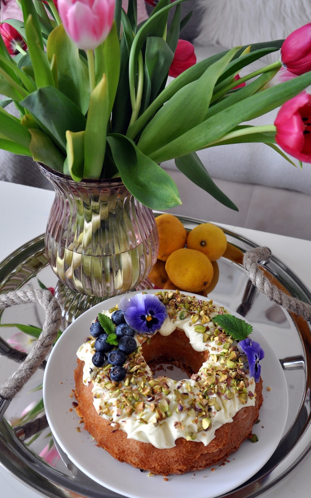Zutaten: Butter und Mehl für die Form 1 Bio-Zitrone 200 g Mehl 1 TL Backpulver 125 weiche Butter 200 g Zucker 2 Eier (Gr. M) 150 g Mascarpone 100 g geröstete und gesalzene Pistazien in der Schale 100 g Puderzucker